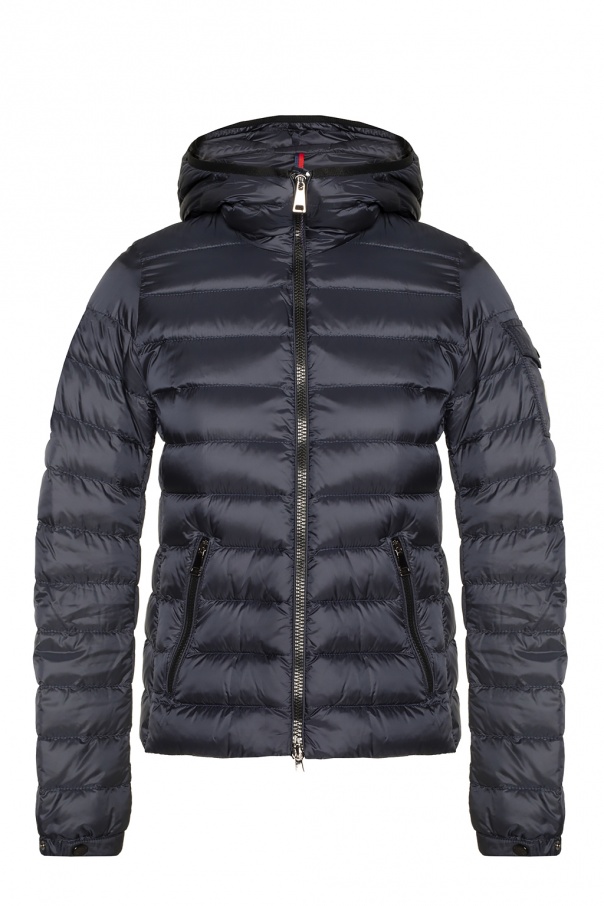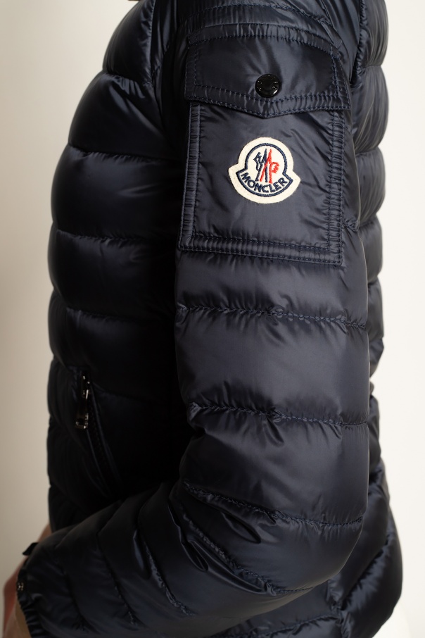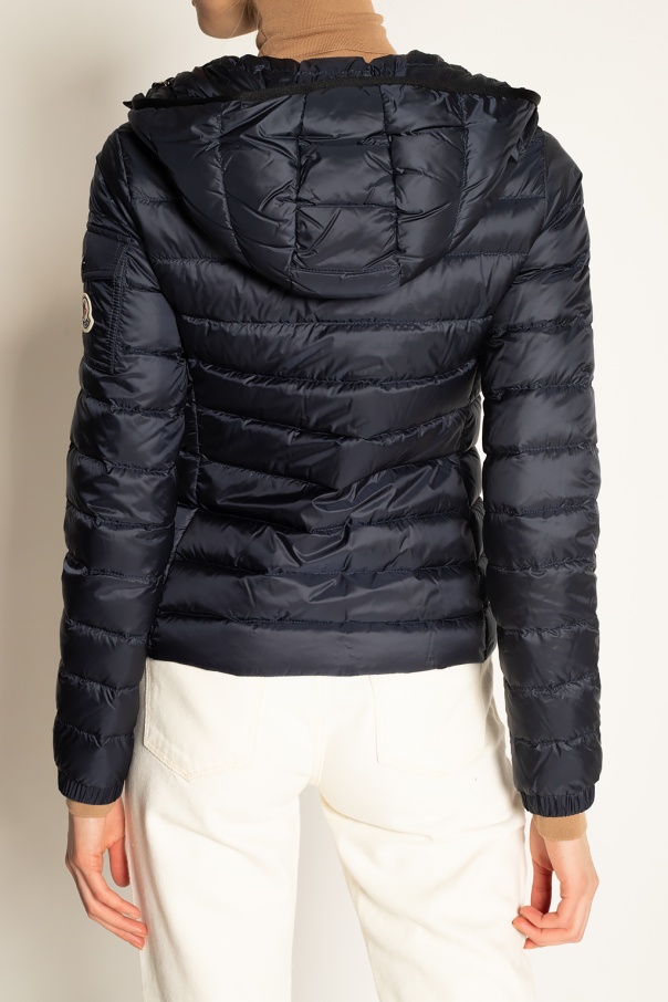 Navy ‘Bles’ quilted jacket from Moncler. Fastened with drawstrings, this design features a two-way zip, cream, red and navy logo patch and two front zip pockets.