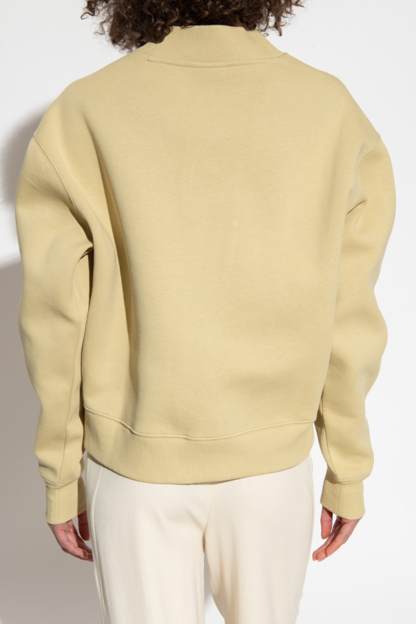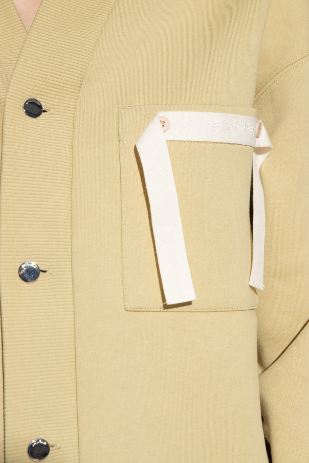 Greenish beige V-neck sweatshirt from Jacquemus. Crafted from cotton, this style features a detachable cream strap with an embroidered logo, front button fastenings, a slip chest pocket, long sleeves and elasticized trims on the edges.