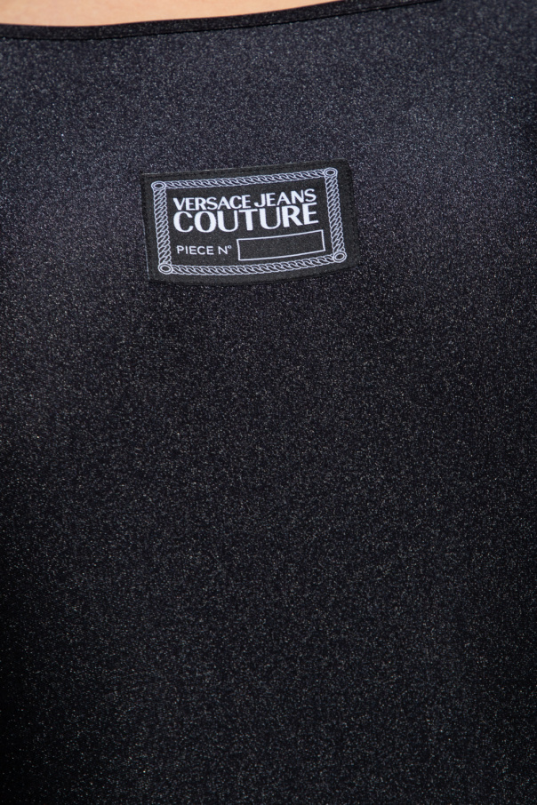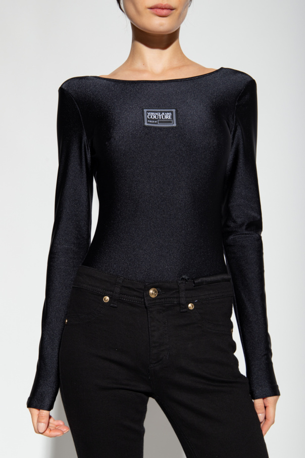 Black body from Versace Jeans Couture. This long sleeve design features a black and white logo patch, low cut back and hook fastenings.