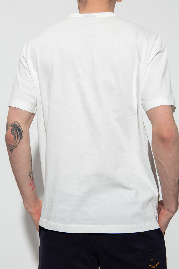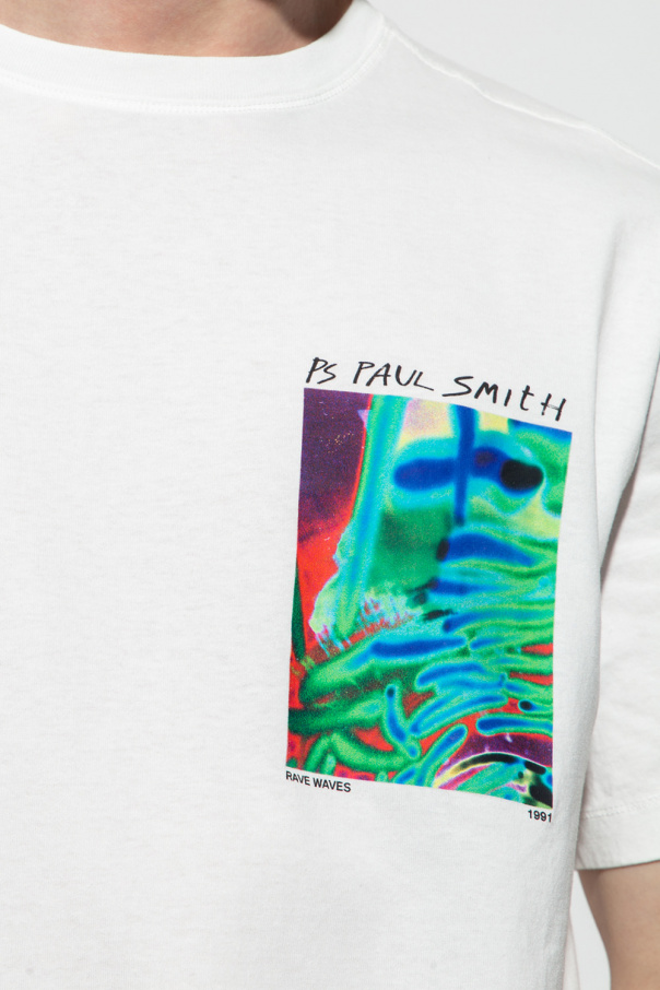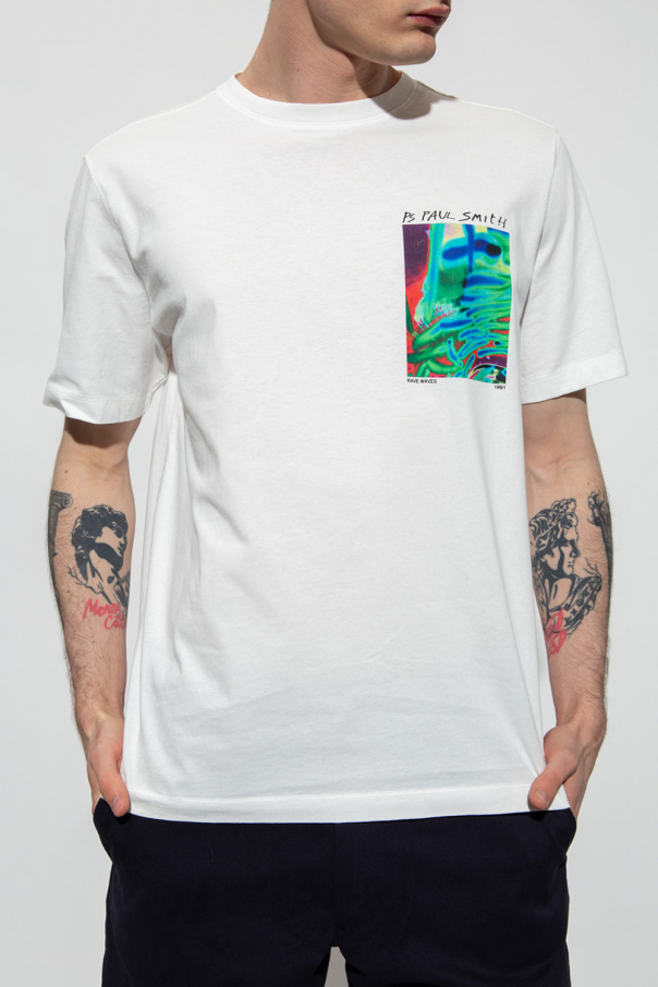 White PS Paul Smith T-shirt. Made of organic cotton. Front decorated with a colorful \'Rave Waves\' print and a black logo. Round neckline finished with elasticated hem. Short sleeves. Slits at the bottom.