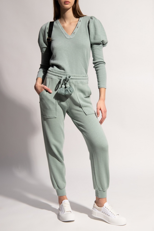 Green ‘Charley’ sweatpants from Ulla Johnson. Made of cotton, this design features a drawstring waist, fringed appliques, two front pockets, two back pockets and ribbed cuffs.