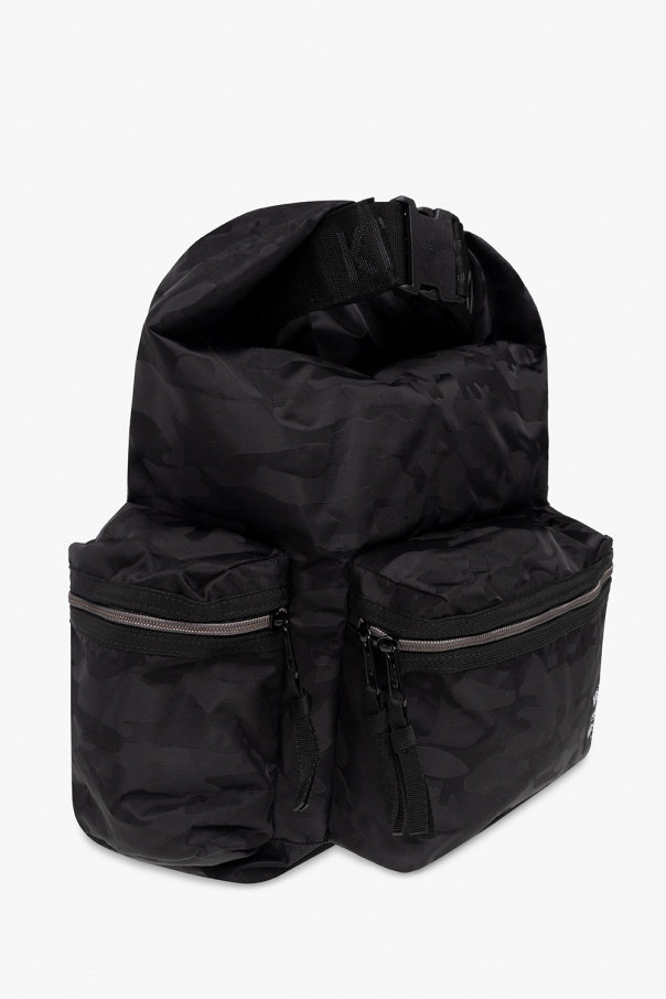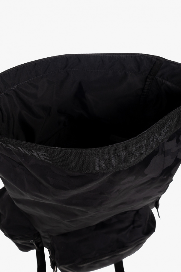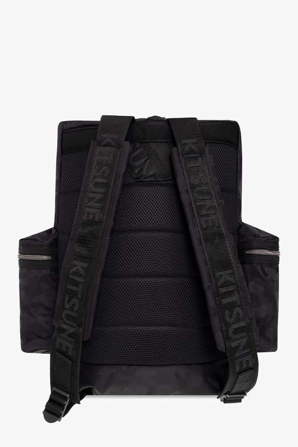 Black backpack from Maison Kitsune x Eastpak. Crafted from recycled material with waterproof properties, this design showcases a camo pattern accompanied by a logo and a wrapped top with a snap closure. It is complete with three zip pockets, adjustable shoulder straps, black and silver-tone metal hardware and one internal compartment with two slip pockets.