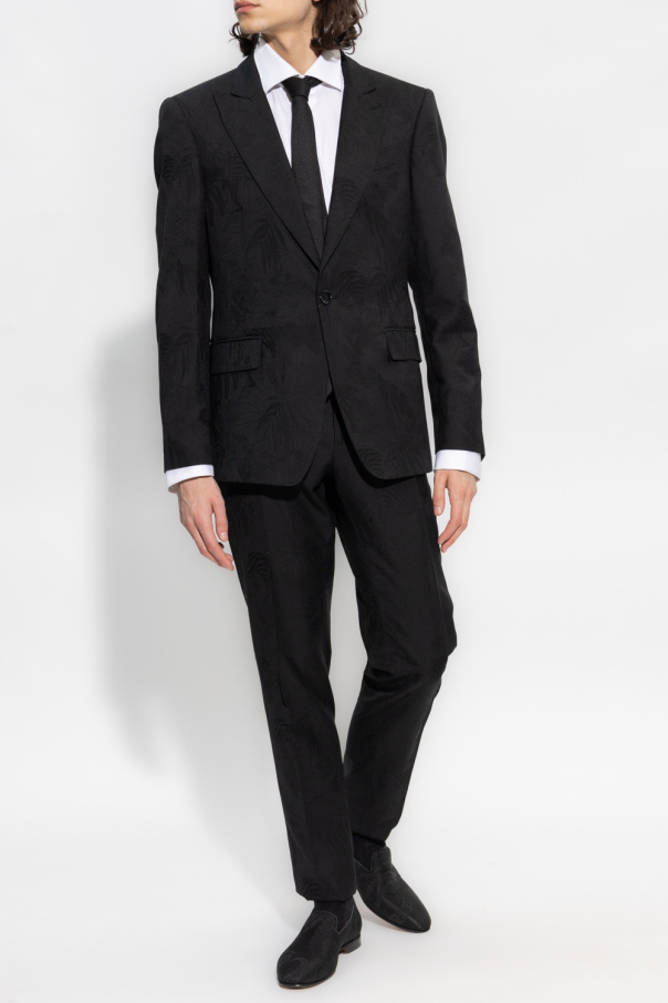 Black suit from Etro. Crafted from a blend of cotton and virgin wool with a jacquard floral motif, this set includes a single-breasted blazer featuring a single button closure, peak lapels, one welt pocket, two flapped pockets, long sleeves with button cuffs and a double back vent as well as pleat-front trousers with a zip fly with a button, two side seam pockets and two back buttoned pockets.