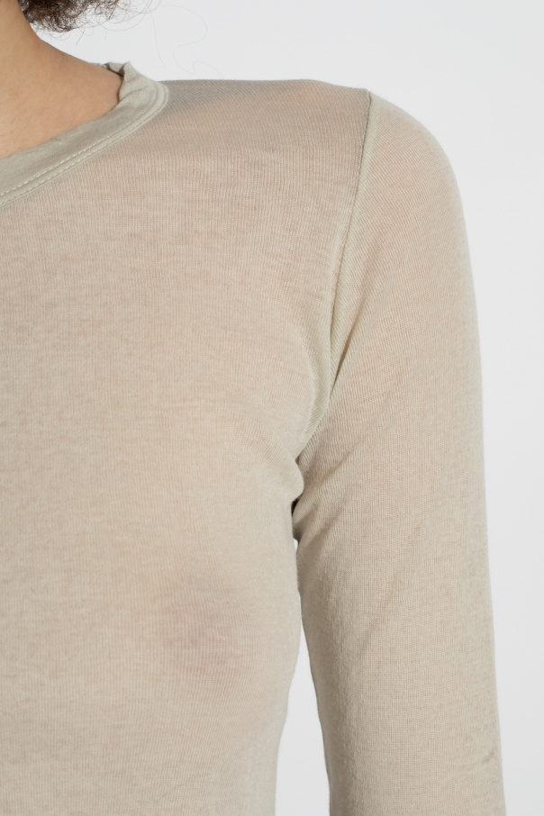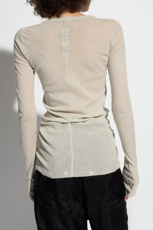 Light grey crewneck T-shirt from Rick Owens. Made of cotton, this style features long sleeves, a raw-trimmed hem and a distinctive seam at the back.
