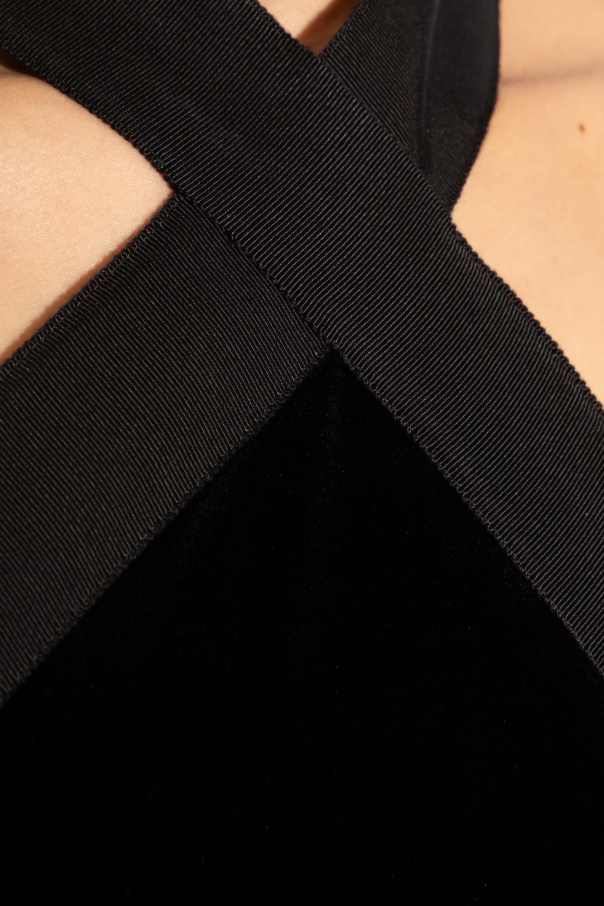 Black bodysuit from Saint Laurent. Rendered in velvet, this style features a deep back opening, crisscross shoulder straps and hook & eye closures on the bottom.