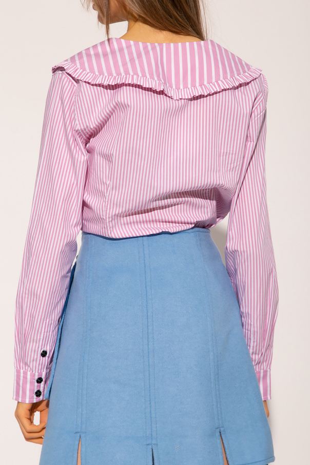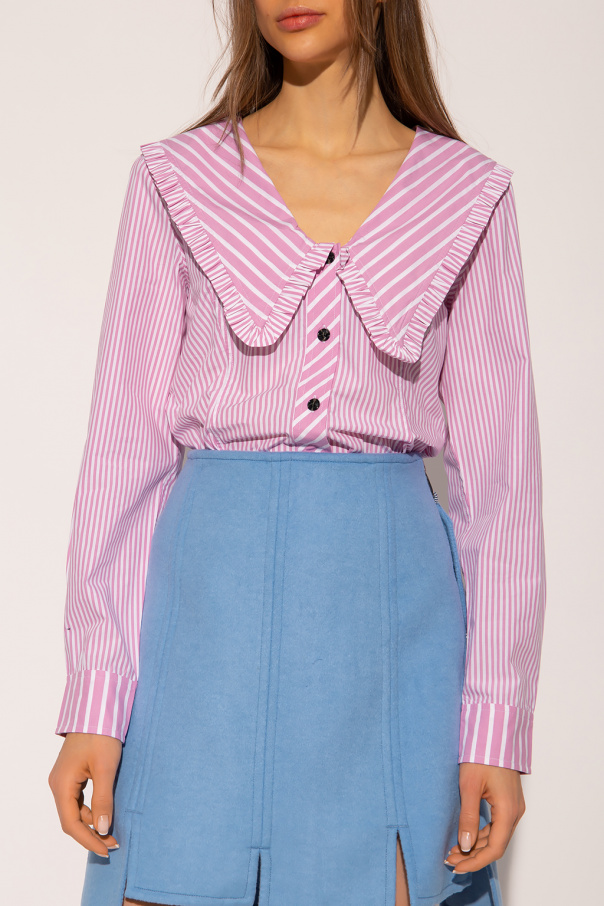 Pink and white shirt from Ganni. Made of organic cotton, this style showcases a stripe pattern. It is complete with button fastenings, a V-neckline with a decorative collar, and puff sleeves with button cuffs.