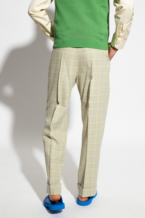 Green and cream trousers from Gucci. Made of wool, this pair falls down with straight pleat-front legs and features a zip, hook and button fastenings, turn-up cuffs, an all-over check pattern, two side seam pockets and two buttoned back pockets.