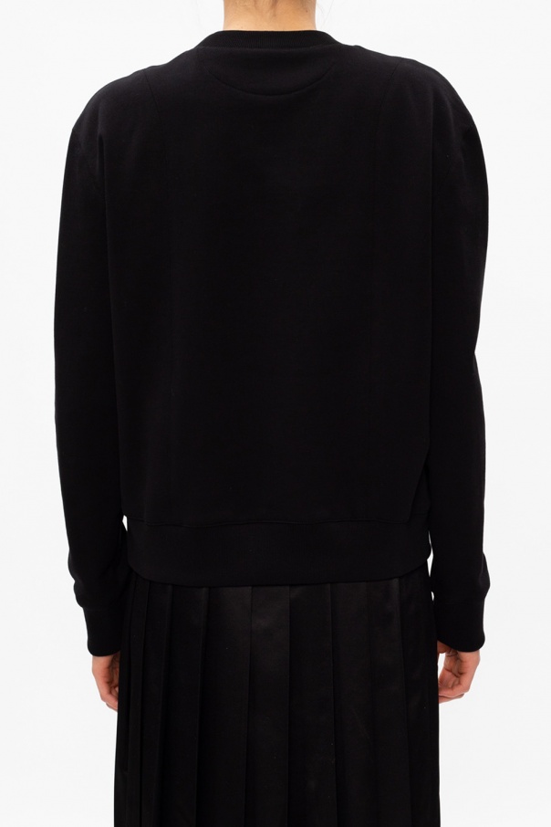 Black crewneck sweatshirt from Versace. This statement piece is crafted from organic cotton and features slashes, gold-tone safety pins, long sleeves and ribbed trims at the neck, hem and cuffs.