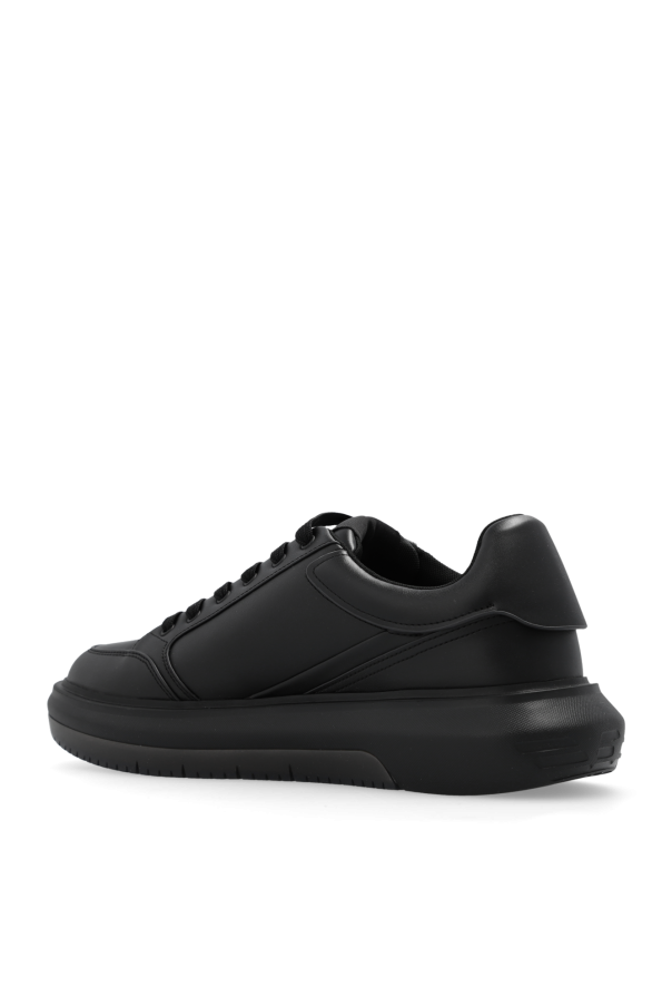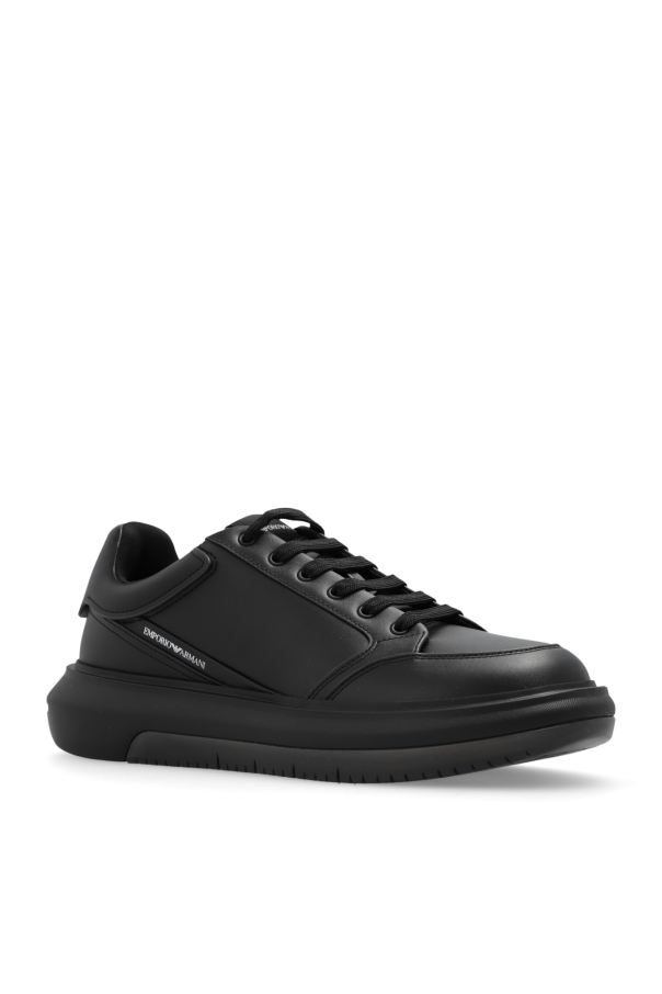 Black lace-up sneakers from Emporio Armani. Made of smooth leather, this pair features a logo patch, printed logo and a white rubber sole.