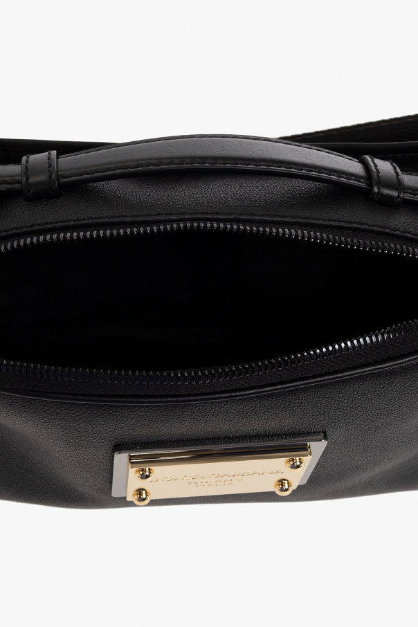 Black belt bag from Dolce & Gabbana. Crafted from calf leather and fabric, this model fastens with a two-way zip and is decorated with a metal logo-engraved logo. It is complete with a zipped back pocket, top handle, adjustable belt with metal buckle, one internal compartment and metal hardware in gold-tone and dark silver-tone.