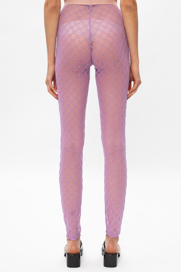 Purple sheer leggings from Gucci featuring an elastic waistband in pink, an embroidered logo pattern and elasticated cuffs.