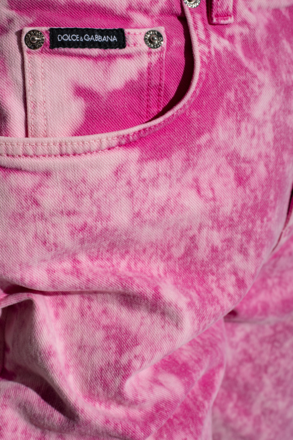 Pink ‘Amber’ jeans from Dolce & Gabbana. Enriched by a tie-dye motif, this pair features a high-waisted silhouette, a zip fly with a button, classic five pockets, a metal logo plaque and tapered legs.