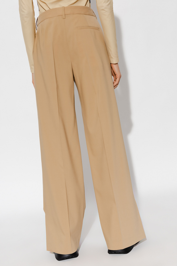 Beige pleat-front trousers from Loewe. Fastened with a hook, button and zip, two front pockets, one back pocket and loose-fitting legs with decorative pleats.