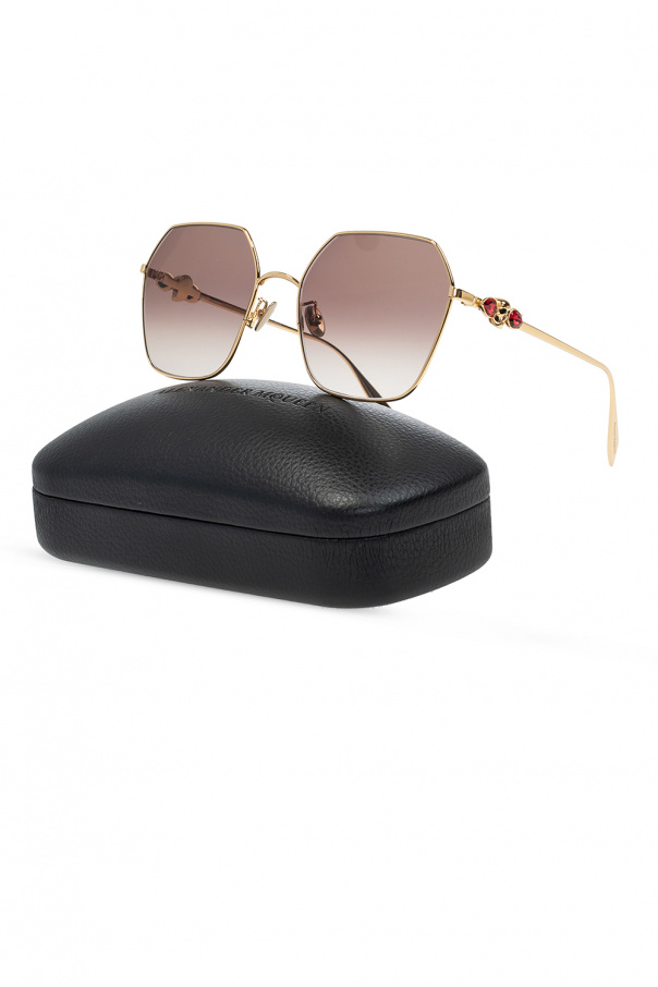 Gold-tone sunglasses from Alexander McQueen. Decorated with a gold-tone, black and red logo appliqué at the temples, this model has certificated brown lenses with 100% UVA/UVB protection.