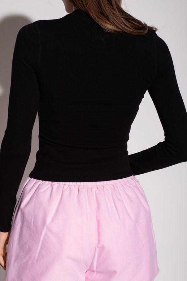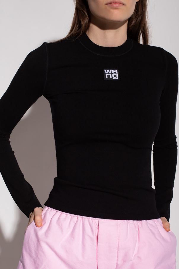 Black T-shirt by Alexander Wang. Decorated with a sewn-on logo in black. Round neckline, long sleeves and bottom hem finished with elastic band.