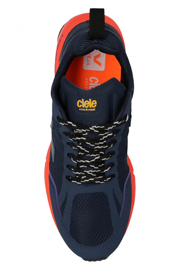 Navy running shoes from VEJA x Ciele. Produced from recycled materials, this lace-up pair features TPU panels, navy V logo, heel support insert made of Pebax® and rubber sole in orange and black.