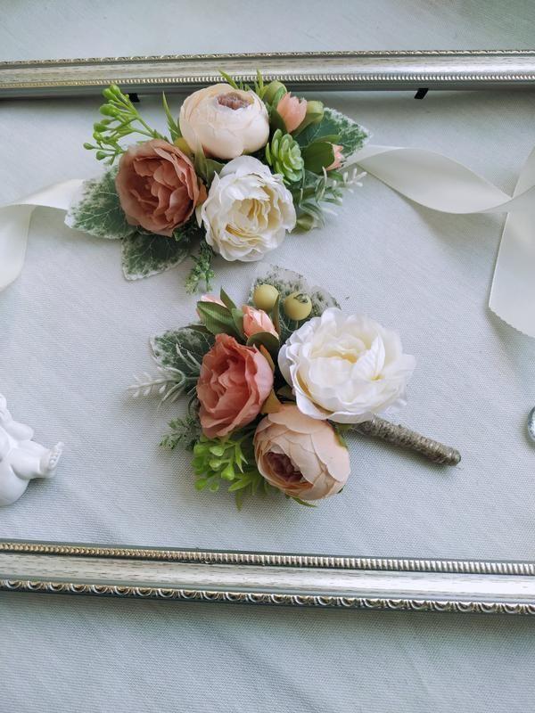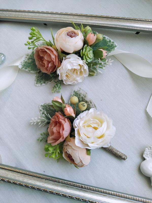 Красивый и нежный комплект бутоньерок в позитивных и солнечных персиковых тонах из роз и пионов. Искусственная зелень, суккуленты и ягодки делают эти мини-букетики очень натуралистичными и живыми. Материалы премиум-класса. Бутоньерки шикарно смотрятся на руке и пиджаке. Они выдержат любую погоду и сохранят свой внешний вид в течении всего длинного свадебного дня, не огорчив вас своим увядшим видом. Возможно изготовление аксессуаров для волос в такой же цветовой гамме.