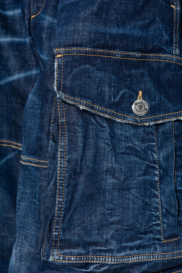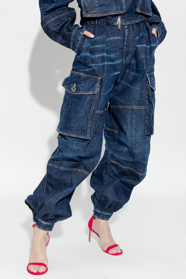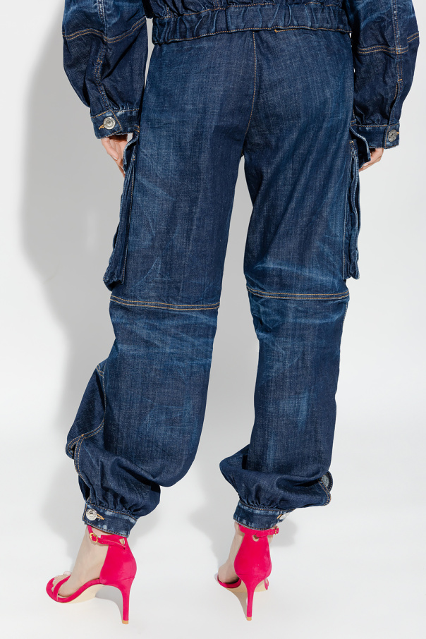 Navy high-waisted jeans from Dsquared2. Fastened with a zip and button, this loose-fitting design features multiple pockets, discolored effect and buttoned cuffs.
