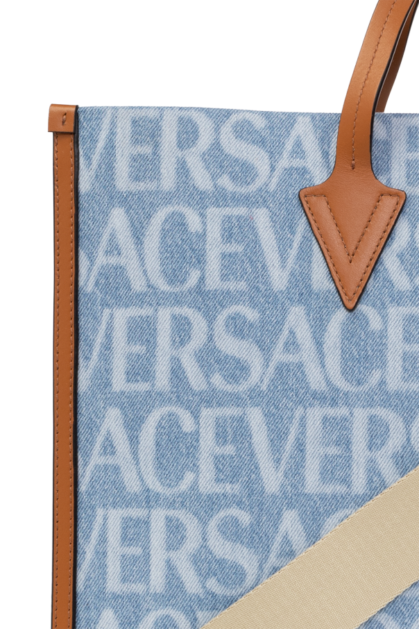 Blue shopper bag from Versace. Rendered in denim and trimmed with calf leather, this design showcases a logo pattern on one side and baroque motif on the other. It is complete with a detachable and adjustable shoulder strap, two half-round handles, gold-tone metal hardware and one internal compartment with one slip pocket and one zip pocket.