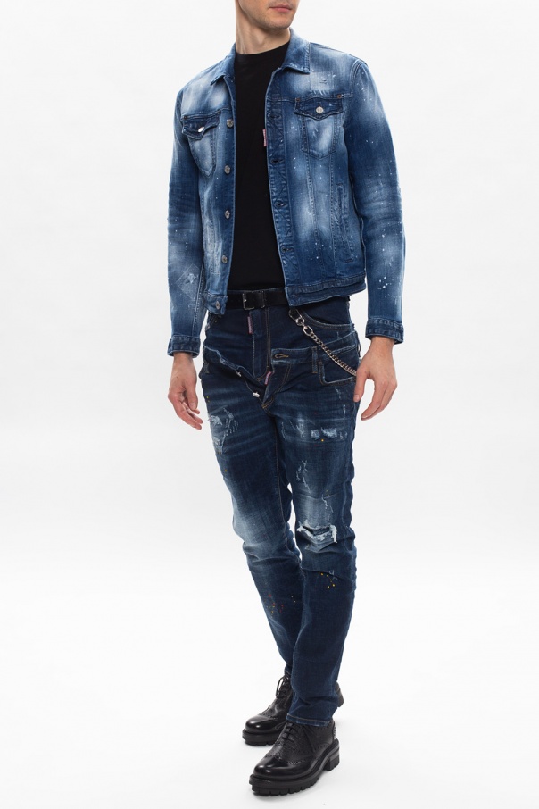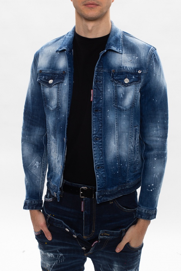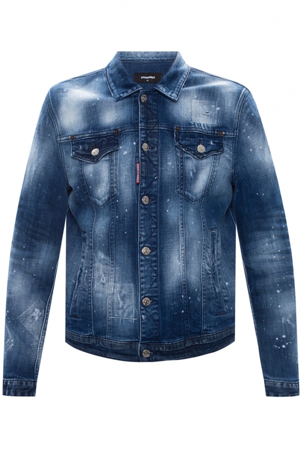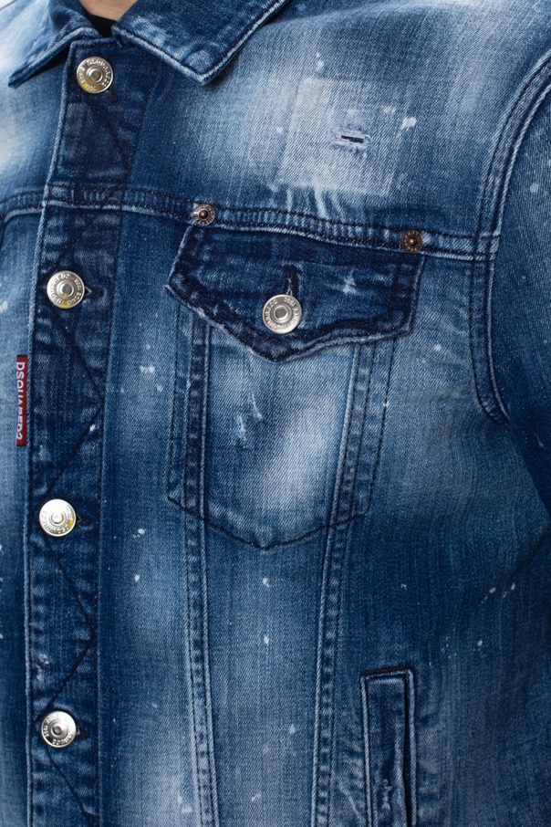 Navy denim jacket from Dsquared2. Fastened with buttons, this design features two slip pockets, two buttoned flap pockets, a worn effect, red patch with a white logo and long sleeves with button cuffs.