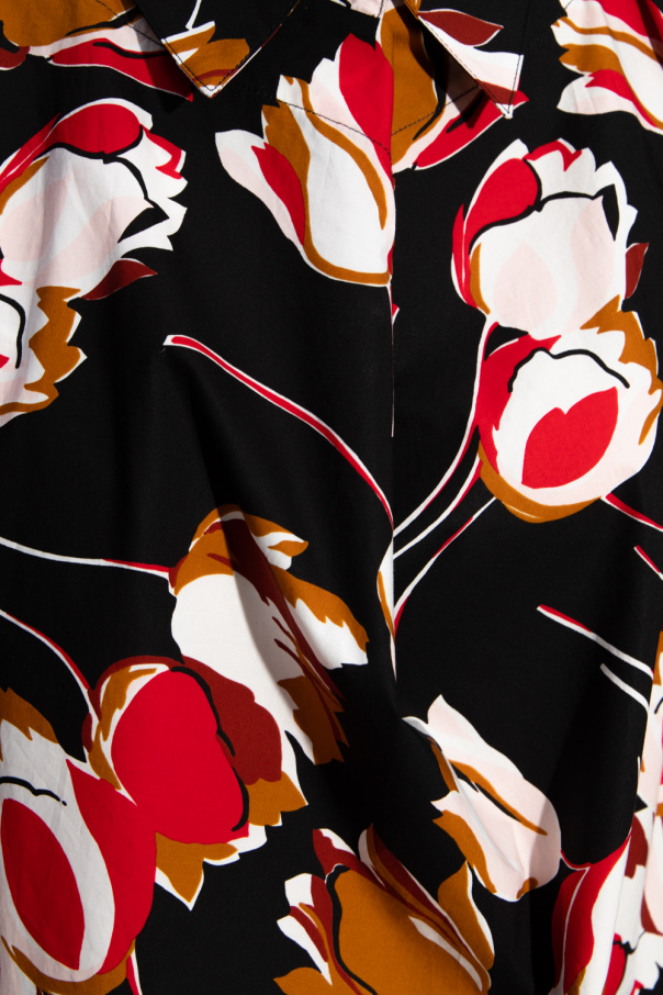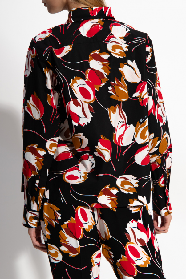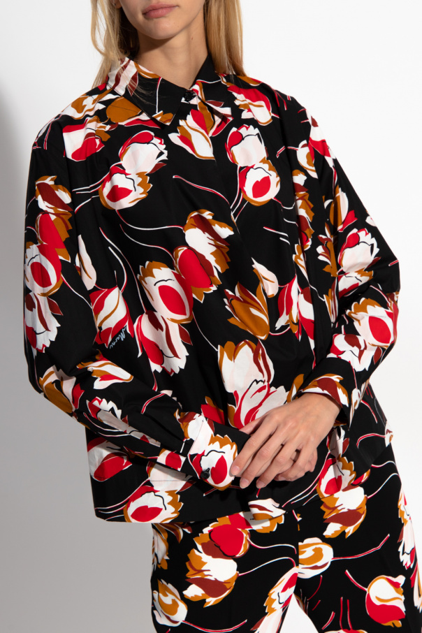 Black shirt from Marni. Made of cotton, this design features a red, white and brown floral pattern, asymmetrical stitching details at the neck and long sleeves with button cuffs.