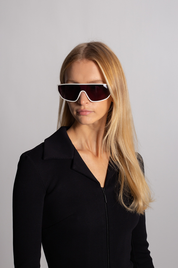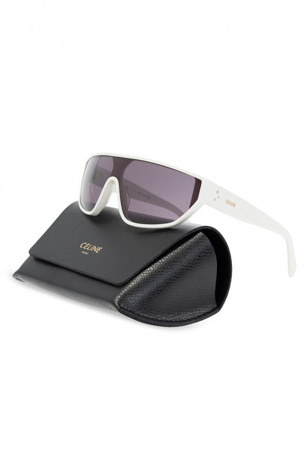 White sunglasses from Celine. This pair features a gold-tone logo detail and black certified UVA/UVB lenses. This item comes with a protective case in black.
