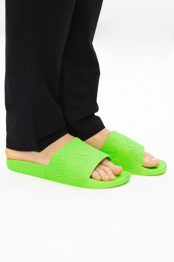 Green slides from Versace Jeans Couture. Set on a green rubber sole, this pair showcases an embossed logo of the brand.