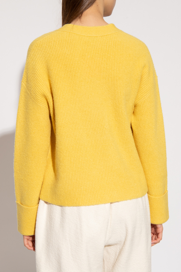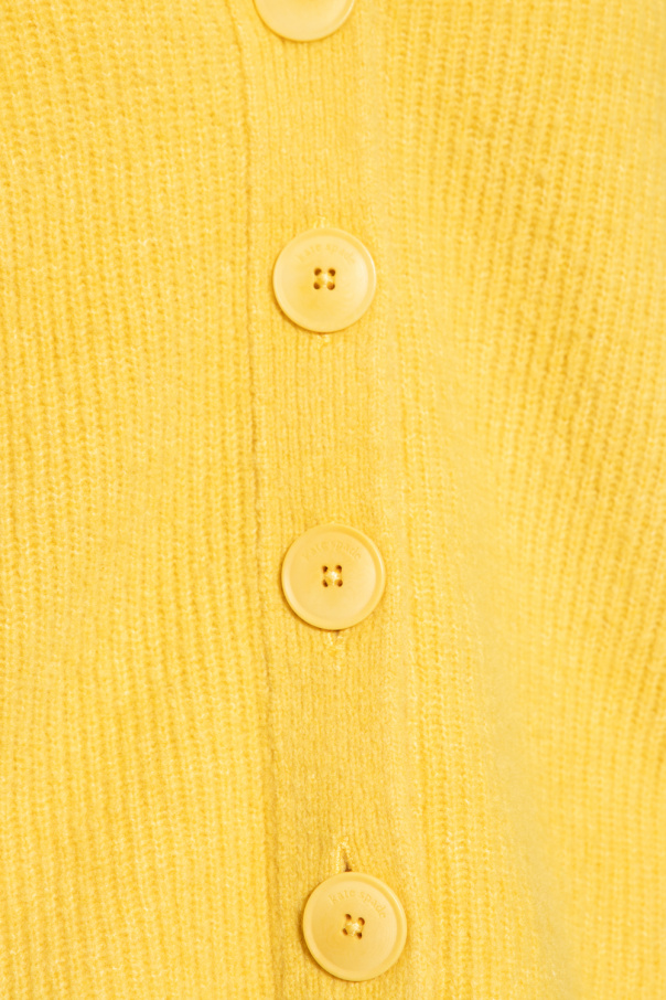 Yellow cardigan from Kate Spade. Fastened with buttons, this V-neck design features a logo embroidery and long rolled sleeves.