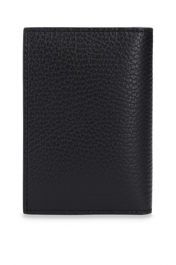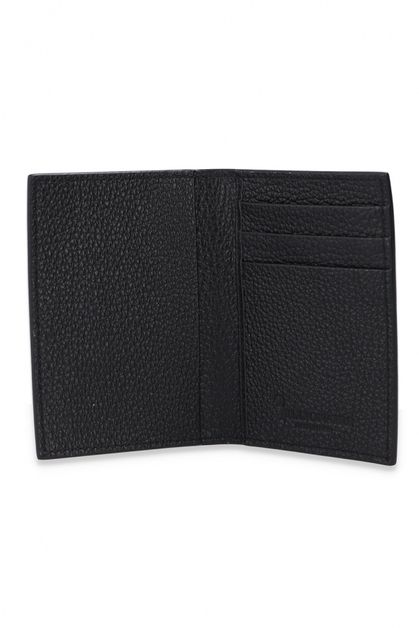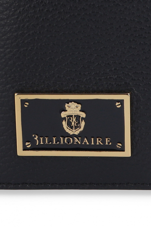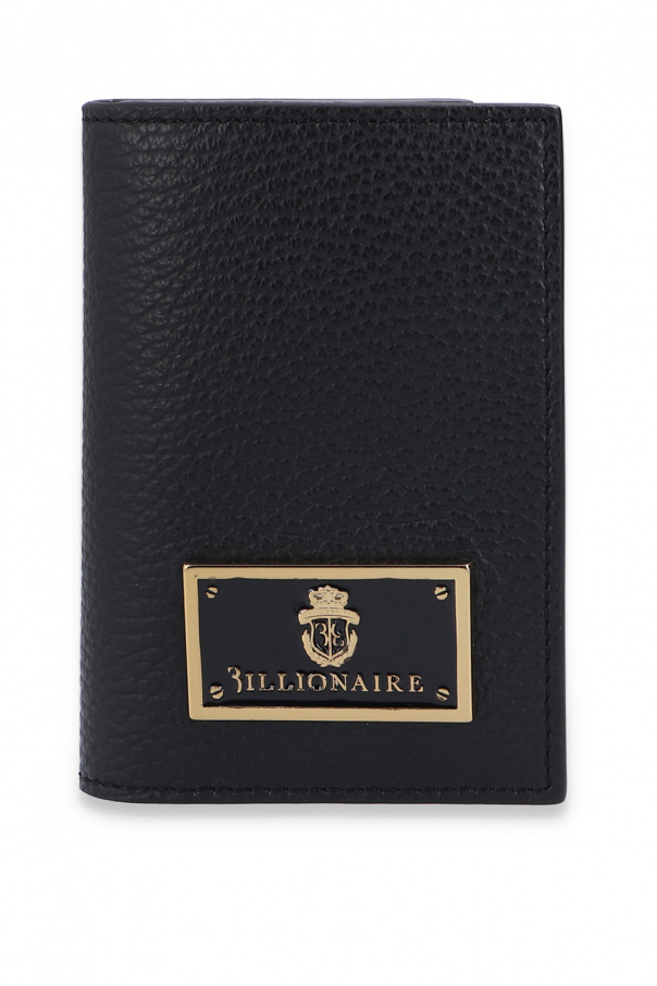Black folding card case from Billionaire. Made of calf leather, this item features a metal logo emblem and two slip pockets and three card slots inside.