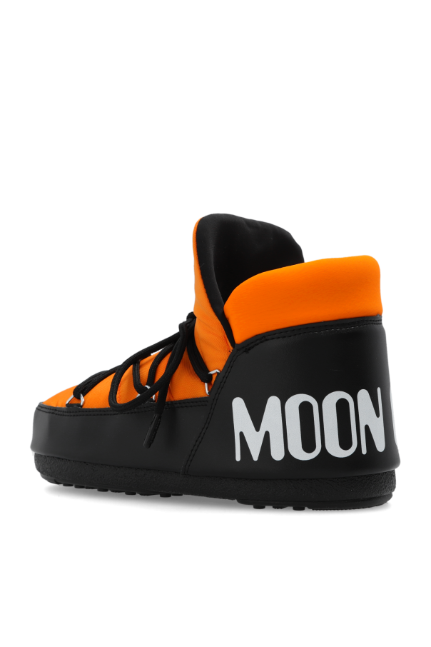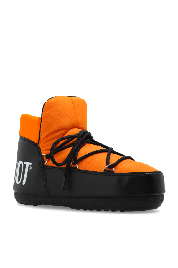 Black and orange ‘Pumps’ waterproof snow boots from Moon Boot. Printed with a black logo, this model sits on a black tread rubber sole with suction cups to ensure superb grip on any surface and showcases a lace-up front and silver-tone metal hardware. Inspired by the peculiar shape and technology of the astronauts’ boots, the iconic style was designed in 1969 after the first Moon landing.