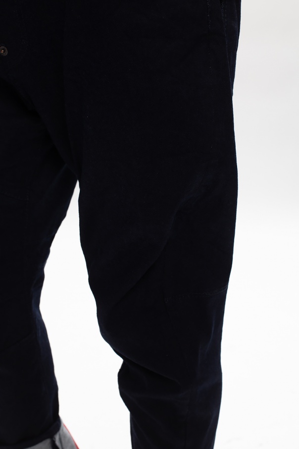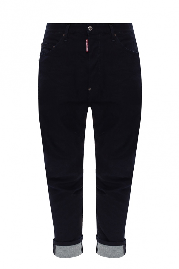 Navy blue 'Combat Jean' jeans from Dsquared2. Crafted from stretchy cotton denim, this pair fastens via buttons and showcases logo patches, classic five pockets, exposed seams and turn-up cuffs with a red logo detail.