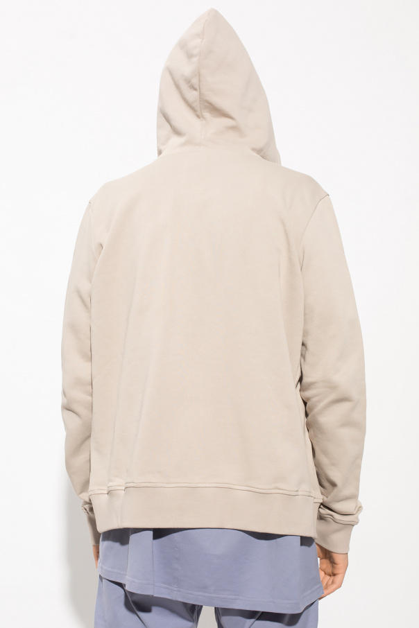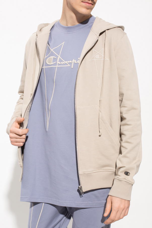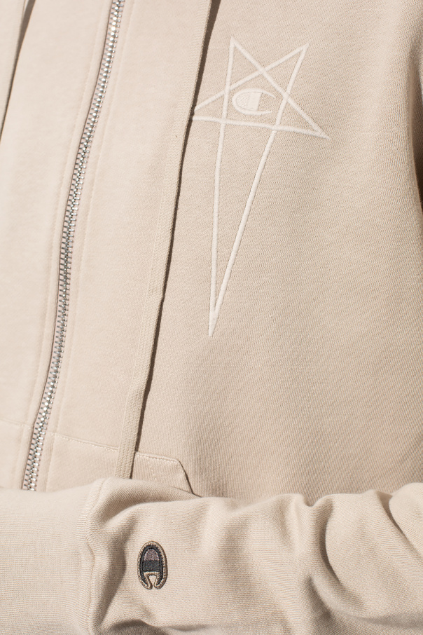 Greyish beige sweatshirt with a drawcord-adjustable hood from Rick Owens x Champion. Crafted from cotton jersey, this style features a zip fastening, logo embroidery, two slip pockets and an elasticated bottom hem and cuffs.