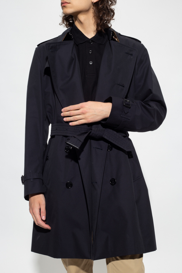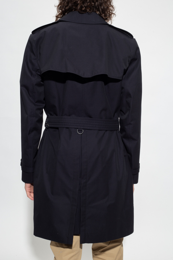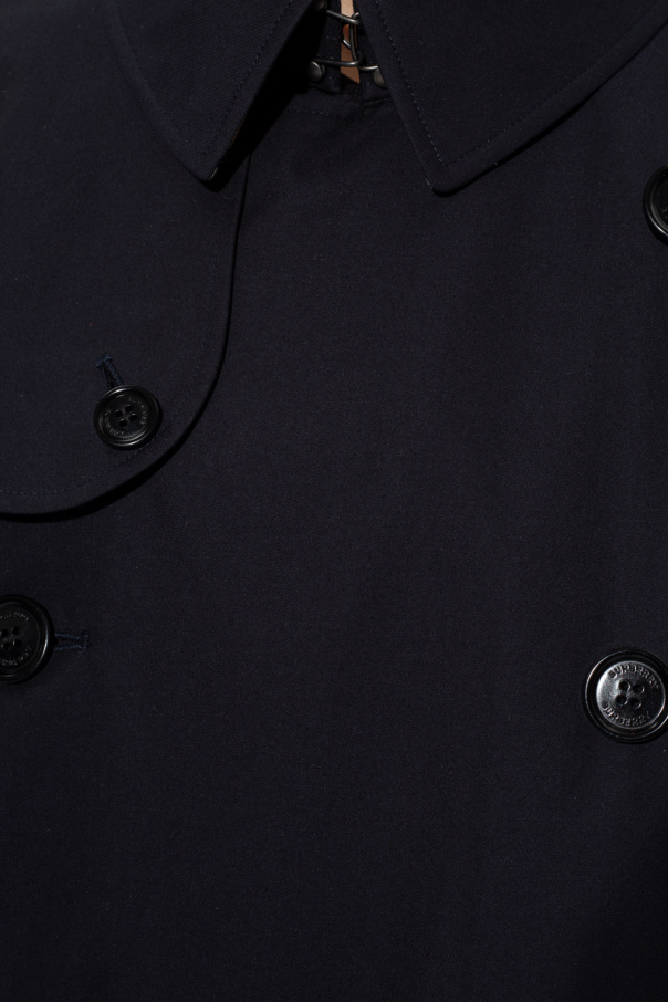 Dark navy blue ‘Kensington’ double-breasted trench coat from Burberry. Made of cotton, this style features button fastenings, a waist-cinching belt, a collar with a hook closure, shoulder epaulettes, a buttoned storm flap on the front, two slip pockets, single back vent and long sleeves with cuffs.