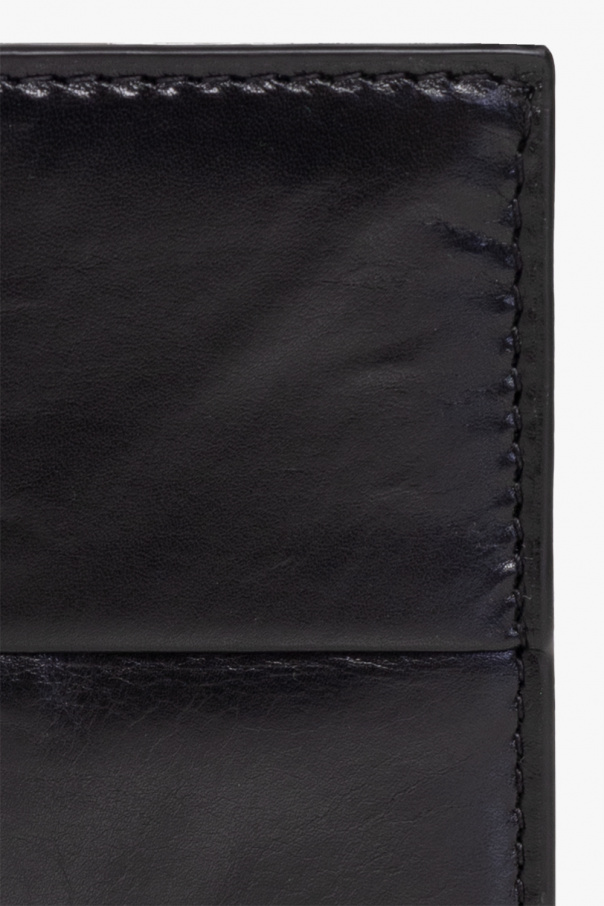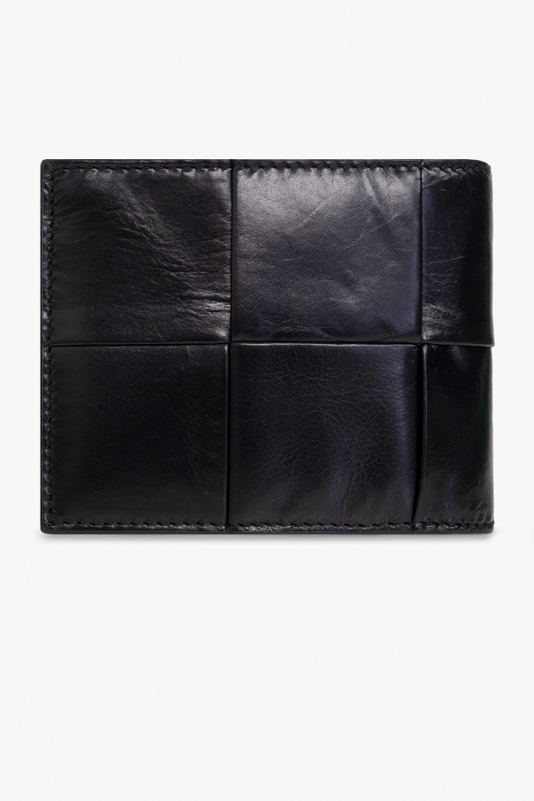 Black bifold wallet from Bottega Veneta. Made of calf leather with the brand’s signature Intreccio weave, it has a bill compartment, two slip pockets and three card slots inside.
