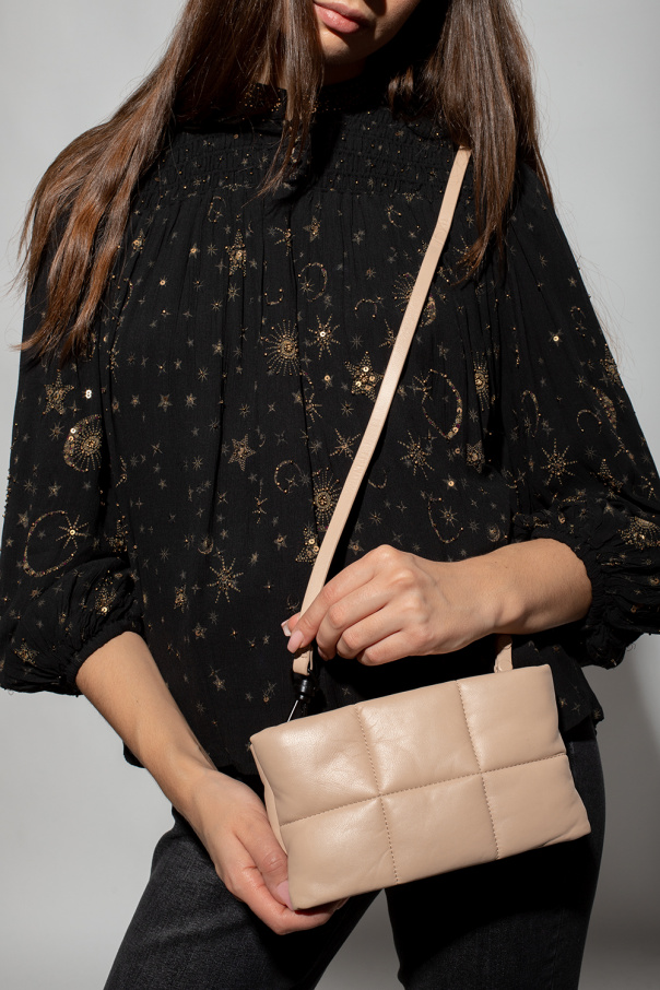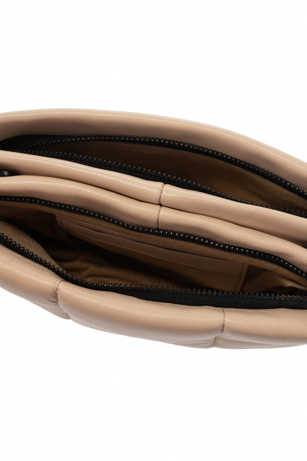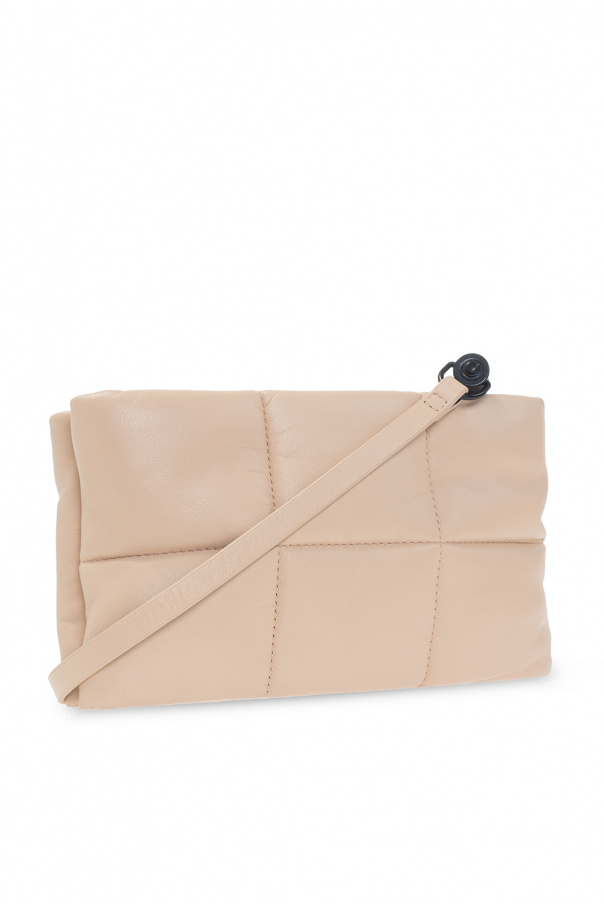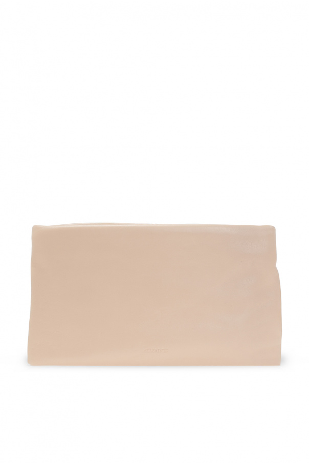 Beige ‘Mila’ quilted clutch from AllSaints. Crafted from sheep leather, this design fastens via a zipper and showcases an embossed logo, a detachable shoulder strap, black metal hardware and an interior with three compartments: two are zipped.