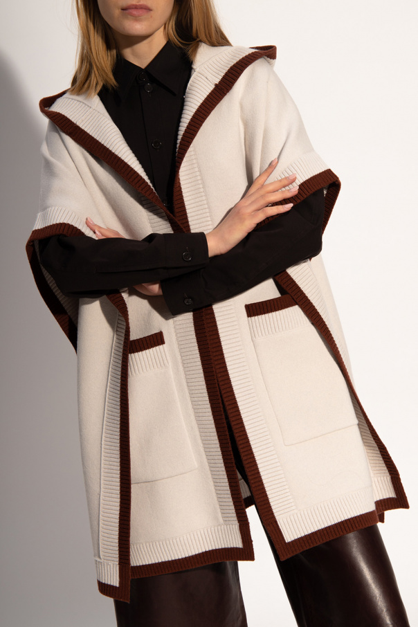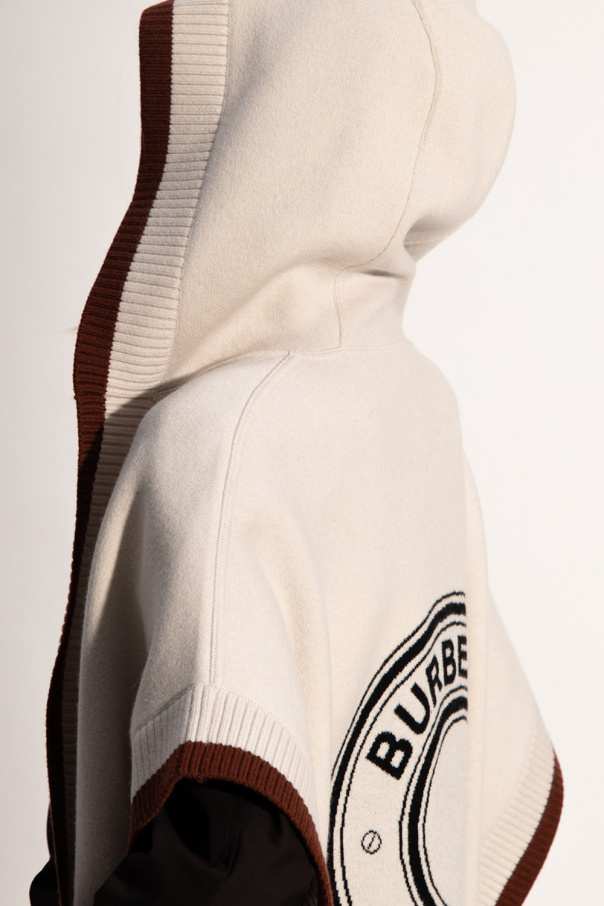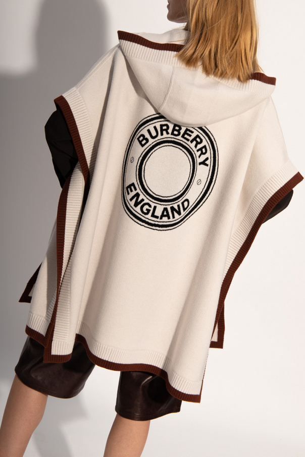 Cream and brown hooded poncho from Burberry. Made of a wool and cashmere blend, this garment is complete with a black logo embroidery and two front slip pockets.
