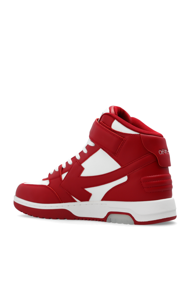 White and red ‘Out Of Office’ high-top sneakers from Off-White. Made of leather with fabric trims, this lace-up pair features a logo-embossed velcro fastening, perforated front, the brand’s signature arrow on the side, embossed logo at the back, zip tie tag and rubber sole in white and red with transparent inserts.