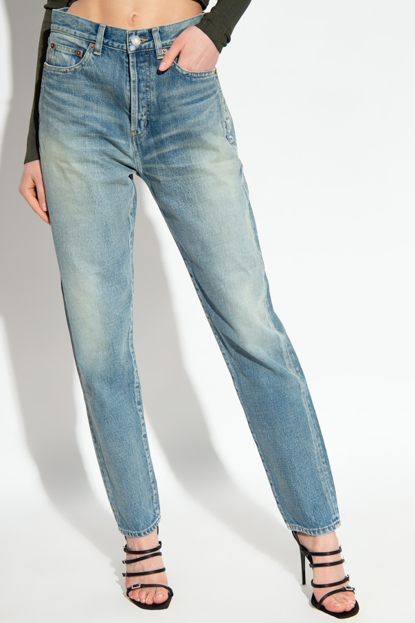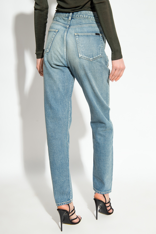 Blue high-rise jeans from Saint Laurent. Falling with slightly tapered legs, this pair features a zip fly with a button, classic five pockets, distressed detailing and a back logo patch.
