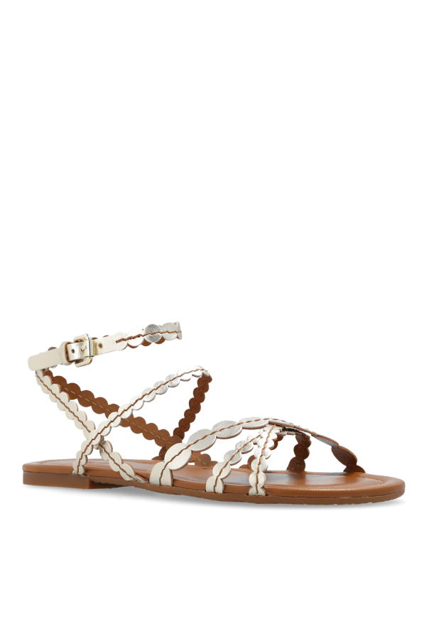Gold-tone ‘Kaddy’ sandals from See By Chloé. Made of leather, this model sits on a brown rubber sole and features an adjustable ankle strap with a buckle.