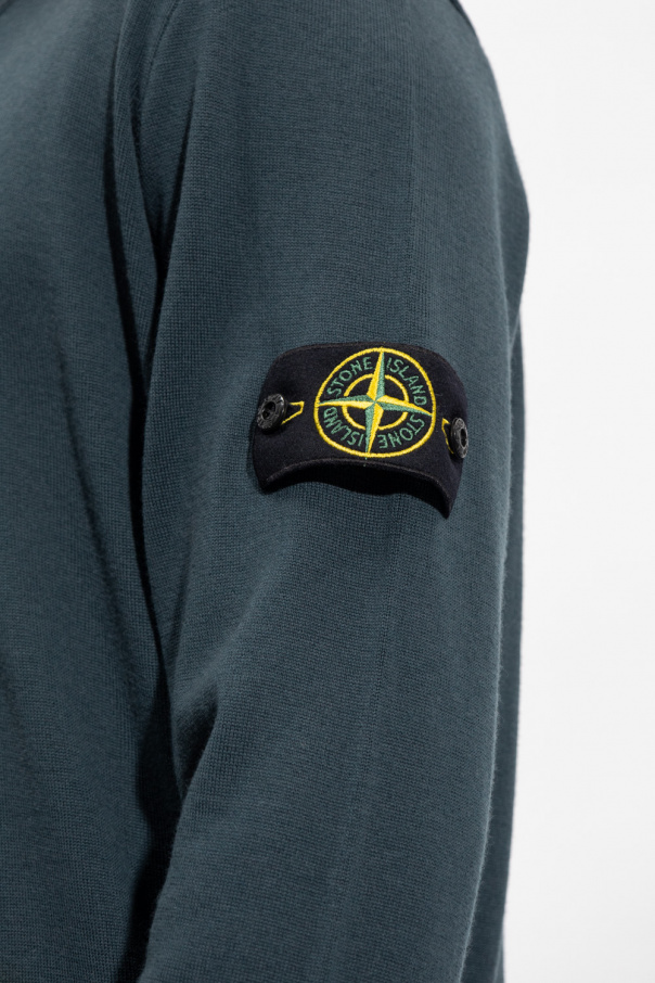Dark greyish blue crewneck sweater from Stone Island. Crafted from wool, this style features a black, yellow and green logo patch, long sleeves and a ribbed collar, bottom hem and cuffs.