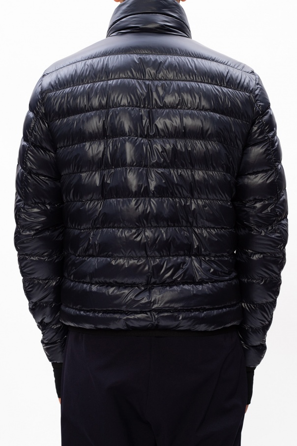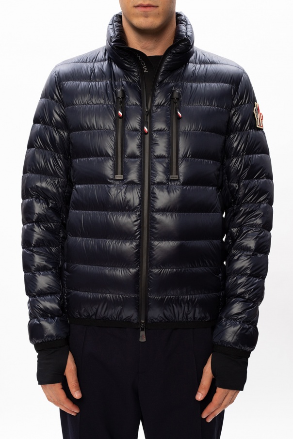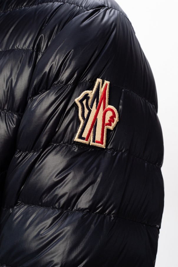 Navy blue ‘Hers’ quilted down jacket from Moncler Grenoble. Offering superb insulating properties, this design fastens via two-way zip closure and employs four zip pockets on the front as well as long sleeves, one of which has a detachable logo patch.