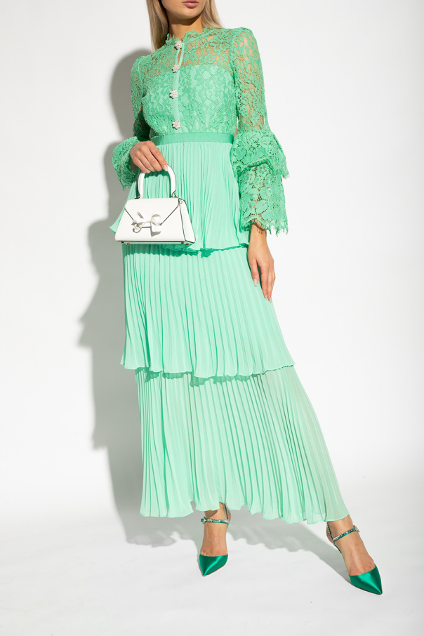 Green ‘Gemcut’ pumps from Stuart Weitzman. Rendered in satin, this model features a pointed toe silhouette, a cream leather sole and an adjustable strap with a crystal-bejewelled buckle.