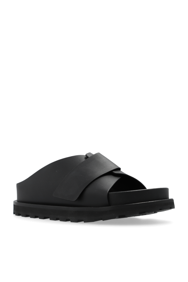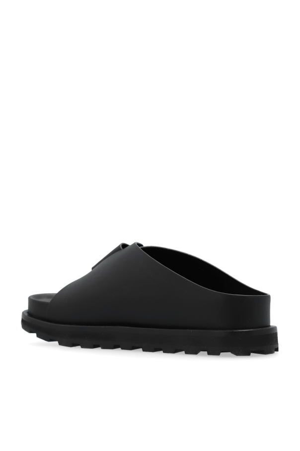 Black slides from Jil Sander+. Made from leather, this model sits on a black rubber sole and features a velcro strap on the front.