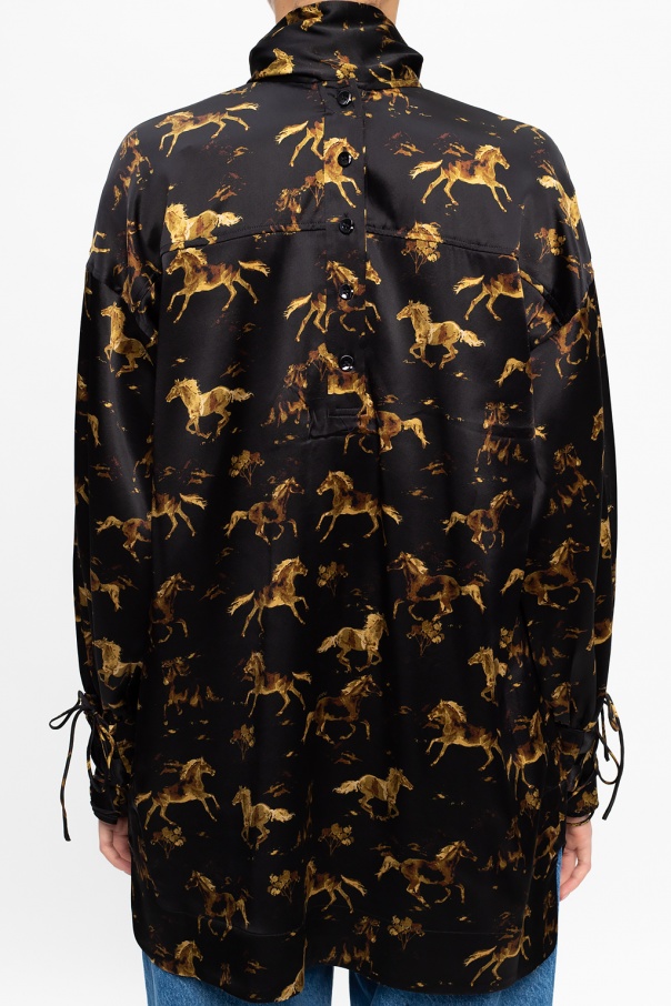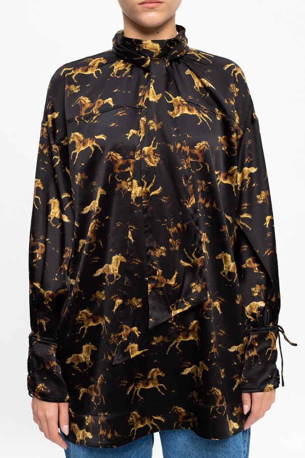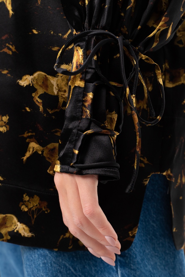 Black shirt from Ganni. Crafted from silk, this design features a yellow pattern and decorative tie detail at the back.