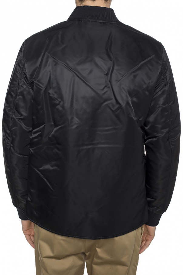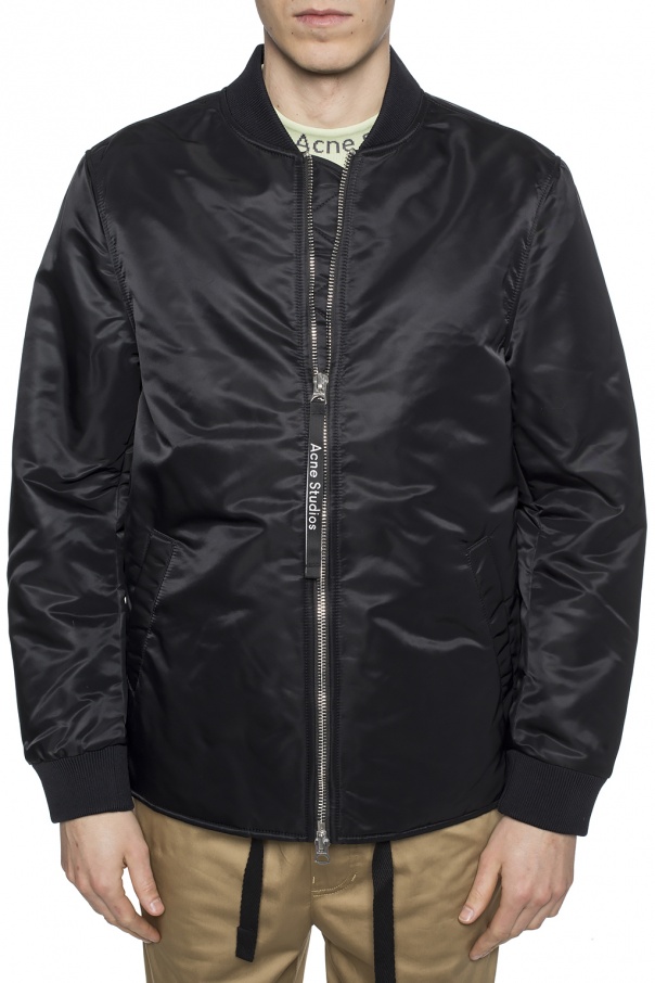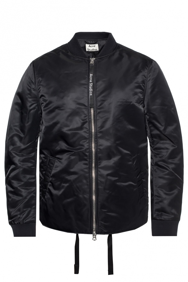 Black insulated jacket from Acne Studios. Fastened with a two-way zip decorated with a black charm featuring a white logo print. Ribbed round neck and cuffs.