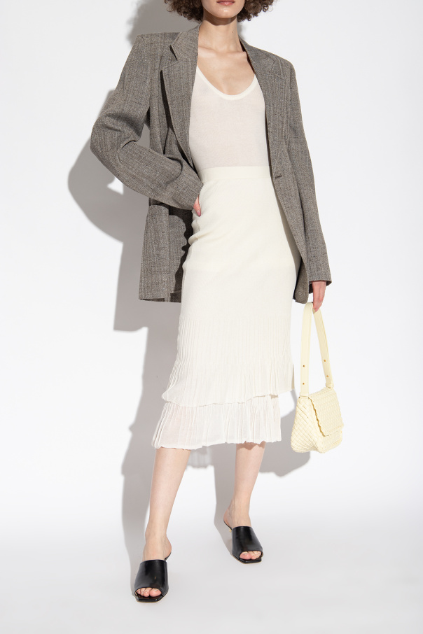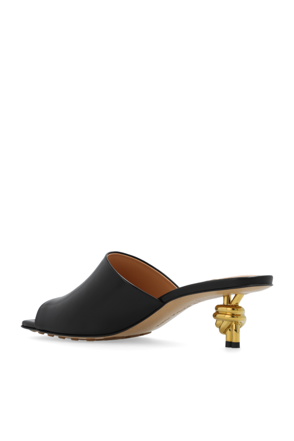 Black mules from Bottega Veneta. Made from lamb leather with a square toe, this model sits on a beige leather sole with anti-skidding elements to ensure stability and features a distinctive heel in gold-tone metal.