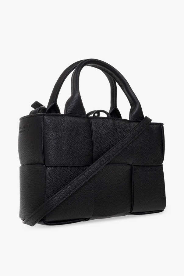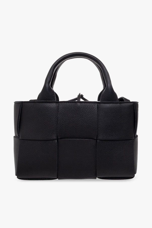 Black ‘Arco Micro’ shoulder bag from Bottega Veneta. Crafted from lamb leather with the brand\'s signature ‘Intreccio’ weave, this design cinches closed with drawstrings and features two half-round handle, a detachable and adjustable shoulder strap, antiqued gold-tone metal hardware and one internal compartment with a removable zip pouch.