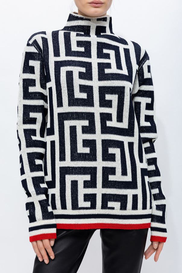 White and black loose-fitting sweater with a high neck from Balmain. Made of a wool blend, this garment features a monogram pattern ribbed trims in red, white and black at the hem and cuffs.