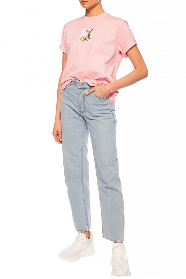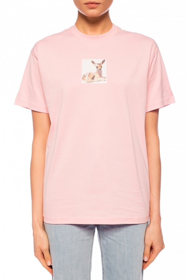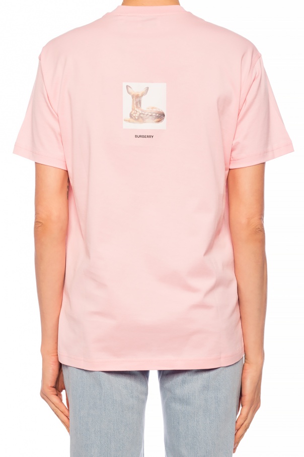 Pink crewneck T-shirt from Burberry. Made of cotton. Embellished with printed grey and brown graphic.