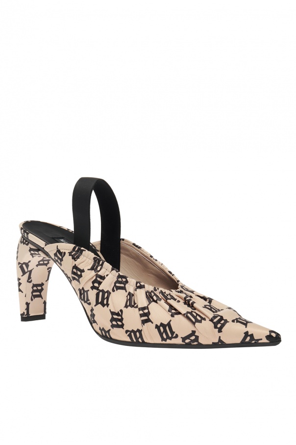 Beige slingback pumps from MISBHV. Made of leather. Enriched by a black logo print. Gathers on the front. Decorative heel. Pointed toe. Black rubber sole.